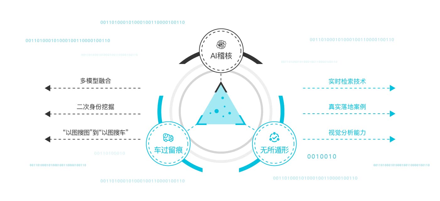 通過視頻結(jié)構(gòu)化,多模型融合和二次身份挖掘,“以圖搜車”,百億級(jí)超大規(guī)模圖像實(shí)時(shí)檢索技術(shù),關(guān)鍵視覺算法全自研,豐富的場(chǎng)景化,逐層遞進(jìn),實(shí)現(xiàn)車輛的無死角分析查詢。
