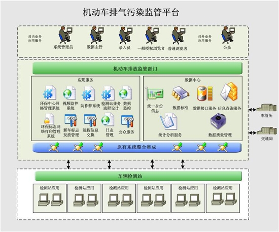 系統(tǒng)不僅監(jiān)管新車、在用車標(biāo)志使用情況,監(jiān)測(cè)在用車檢測(cè)情況和檢測(cè)設(shè)備的工況情況,而且通過和路檢、臨檢和遙感測(cè)量的檢測(cè)信息比對(duì),對(duì)在用車及檢測(cè)場(chǎng)進(jìn)行及時(shí)監(jiān)管。