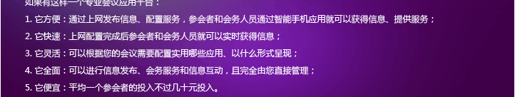 萬(wàn)網(wǎng)新聚思手機(jī)應(yīng)用會(huì)議系統(tǒng),為會(huì)務(wù)、公關(guān)公司項(xiàng)目經(jīng)理或者公司會(huì)務(wù)組織者提供手機(jī)移動(dòng)應(yīng)用會(huì)議系統(tǒng),主要包括日程、嘉賓資料及時(shí)的會(huì)議更新。