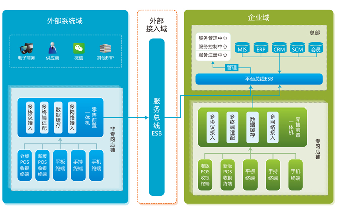 針對(duì)電商、合作伙伴、銀行、微信等外部網(wǎng)絡(luò)接入需求,零售信息整合平臺(tái)提供基于ESB的統(tǒng)一接入方式,實(shí)現(xiàn)外部網(wǎng)絡(luò)域集團(tuán)內(nèi)部網(wǎng)絡(luò)隔離,最大程度的保障集團(tuán)內(nèi)部系統(tǒng)安全。