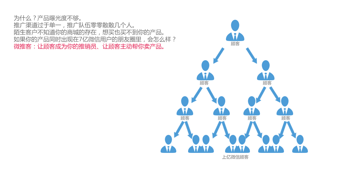 基于買家即賣家的理念,在微信上幫商家分享商城鏈接而賺取傭金的群體,統(tǒng)稱為“微推客”。相當(dāng)于微信商城的商品導(dǎo)購員,為商家推薦客戶、推銷產(chǎn)品。 微推客將商城商品頁面,會(huì)員注冊(cè)頁面、商城首頁等鏈接分享到朋友圈、微信群、QQ、微博等,商家按點(diǎn)擊量、會(huì)員注冊(cè)量、購買下單量付給微推客一定比例的傭金。