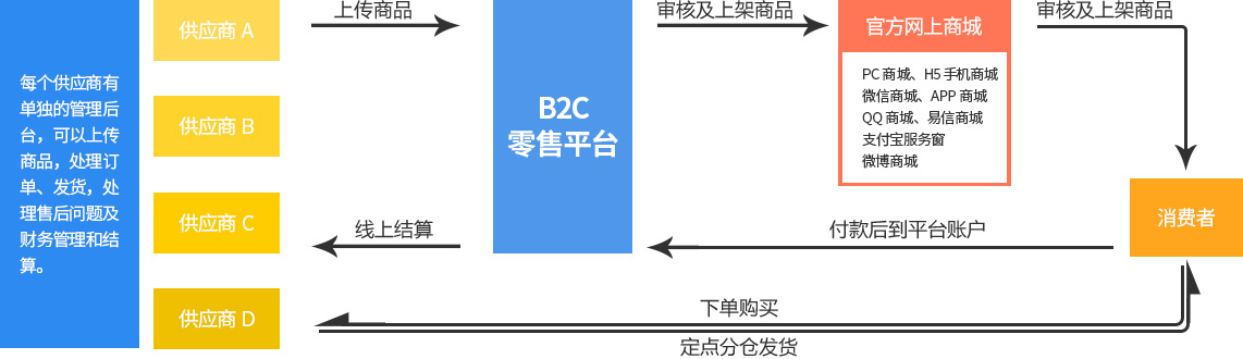 多供應(yīng)商零售電商解決方案,主要是幫助企業(yè)打通上游供應(yīng)鏈,整合已有的資源優(yōu)勢,結(jié)合線上全渠道銷售通道,構(gòu)建一個(gè)智能化的零售商業(yè)生態(tài)圈。0倉儲(chǔ)成本,定點(diǎn)發(fā)貨,是企業(yè)零售運(yùn)營的新模式。