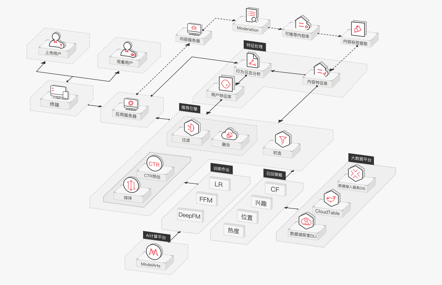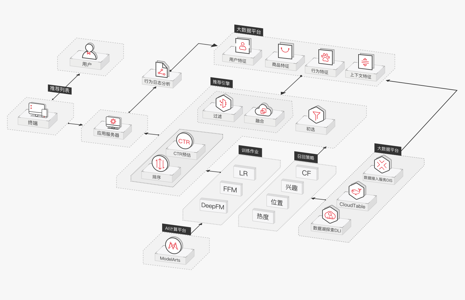 根據(jù)用戶海量訪問、交易等數(shù)據(jù),利用高性能分布式推薦算法,全方位分析用戶各種行為之間的關(guān)聯(lián)性;支持千萬維度特征,分鐘級模型更新