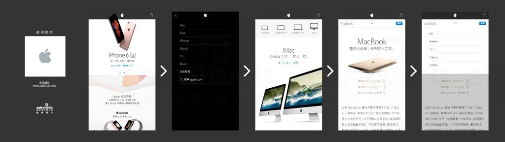 Apple選單使用跳頁方式呈現(xiàn),在選擇產(chǎn)品大分類后,進入該類別的專頁,不使用相同的選單樣式,而選擇使用橫式滑塊,并使用分類圖做搭配,在第三層產(chǎn)品介紹項目頁面中,使用第二階層下拉選單。他將每一層做區(qū)分,并針對每一層的不同需求,而對應(yīng)不同的選擇方式。