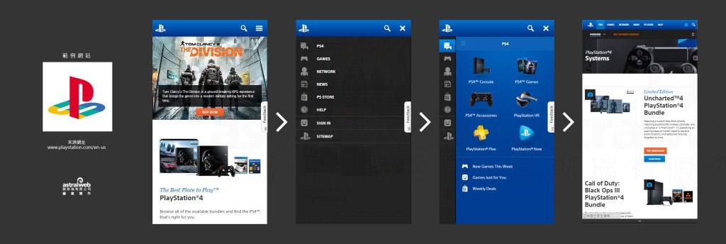 PlayStation在第一層選單點擊后,左側(cè)保留原本第一層分類圖,右側(cè)顯示第二層分類,清楚讓使用者知道現(xiàn)在在哪一個類別之下,使用者在做上一個類別切換時,不需回到上一層做選擇。