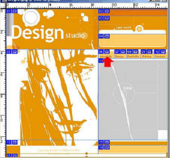 選擇工具板上的slice切片工具,先大刀闊斧的切上一番! 技巧:大面積的色塊單獨切成一塊,盡可能的保持在水平線上的整齊(這個問題你們在后面的制作頁面中深有感觸)切好的圖如下所示: