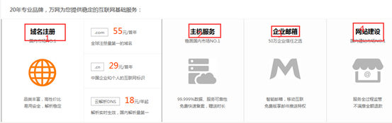 萬網(wǎng)包括域名注冊、主機服務、企業(yè)郵箱、網(wǎng)站建設4部分。