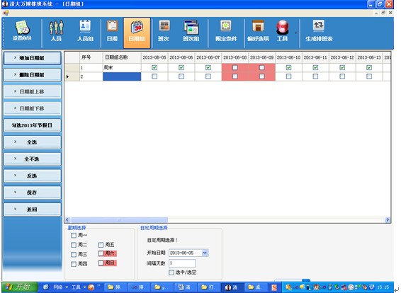 設(shè)定日期集合,可增加、修改、編輯勾選日期組成員,組成員間的復(fù)制粘貼,支持組成員的全選、反選、批量選擇等操作。支持星期選擇、周期選擇、節(jié)假日選擇等各種批量選擇。 |