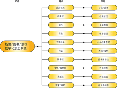 應(yīng)用領(lǐng)域數(shù)字媒介加工系統(tǒng)廣泛應(yīng)用于圖書館、檔案館、博物館、出版社、政府機(jī)關(guān)、銀行、稅務(wù)、保險等機(jī)構(gòu),進(jìn)行圖書、文件、檔案、票據(jù)等的數(shù)字化加工。
