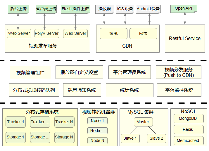 視頻云平臺(tái)是一個(gè)復(fù)雜的分布式軟件系統(tǒng),在技術(shù)選型方面采用目前主流的Java EE平臺(tái)。開發(fā)語言主要使用Java和Python,關(guān)系數(shù)據(jù)庫使用MySQL,NoSQL數(shù)據(jù)庫使用MongoDB、Redis和Memcached,其中,MongoDB主要用于存儲(chǔ)訪問日志,Redis主要用于構(gòu)建具有優(yōu)先級(jí)的分布式隊(duì)列,Memcached用于緩存數(shù)據(jù)。視頻云平臺(tái)的架構(gòu)如圖3所示。