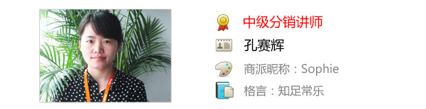 商派中級分銷講師,09年接觸淘寶,11年加入商派分銷團(tuán)隊(duì),以其扎實(shí)、嚴(yán)謹(jǐn)?shù)闹v課風(fēng)范獲得客戶一致好評。2011年半年內(nèi)授課高達(dá)100節(jié),是唯一一個 在短短三個月內(nèi)由預(yù)備講師直接升中級講師的。客戶都稱贊說:“有了Sophie老師,我們做分銷覺得很放心!